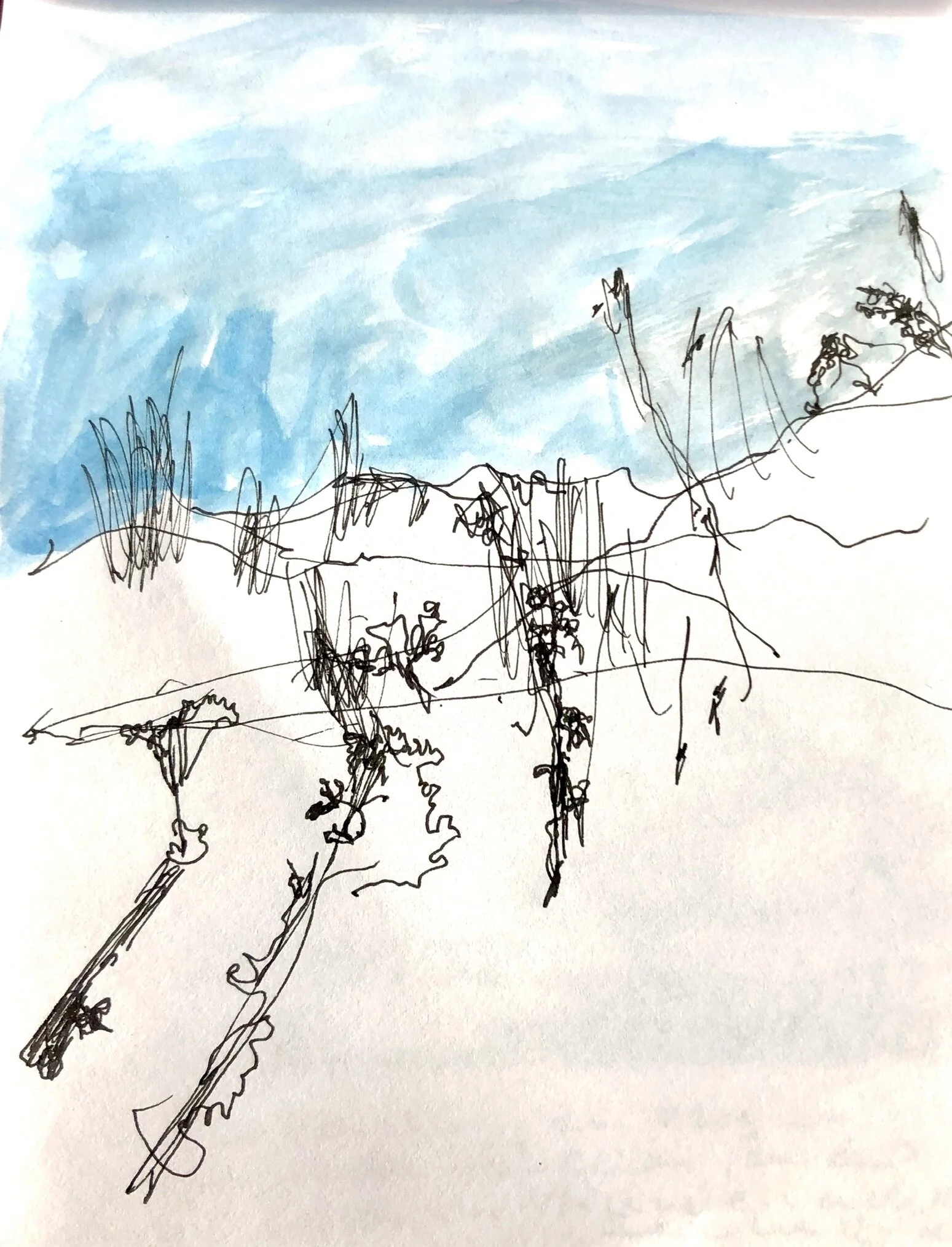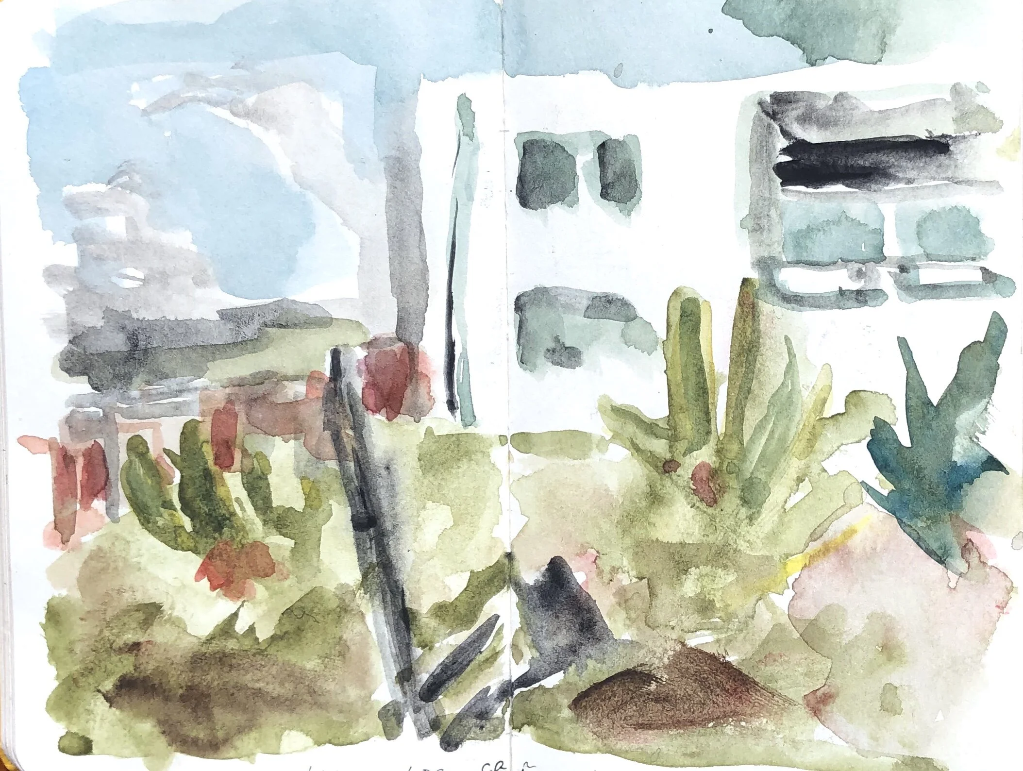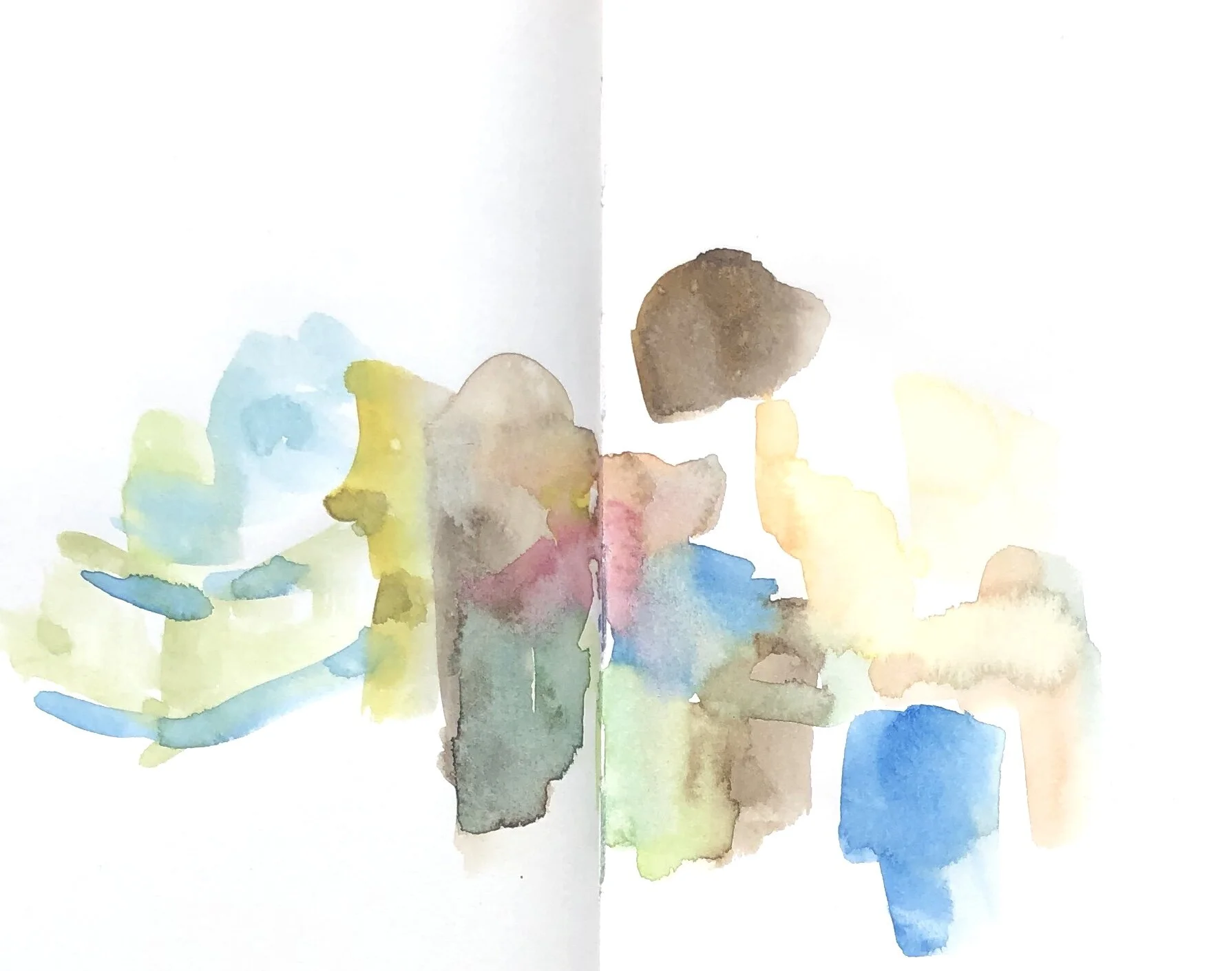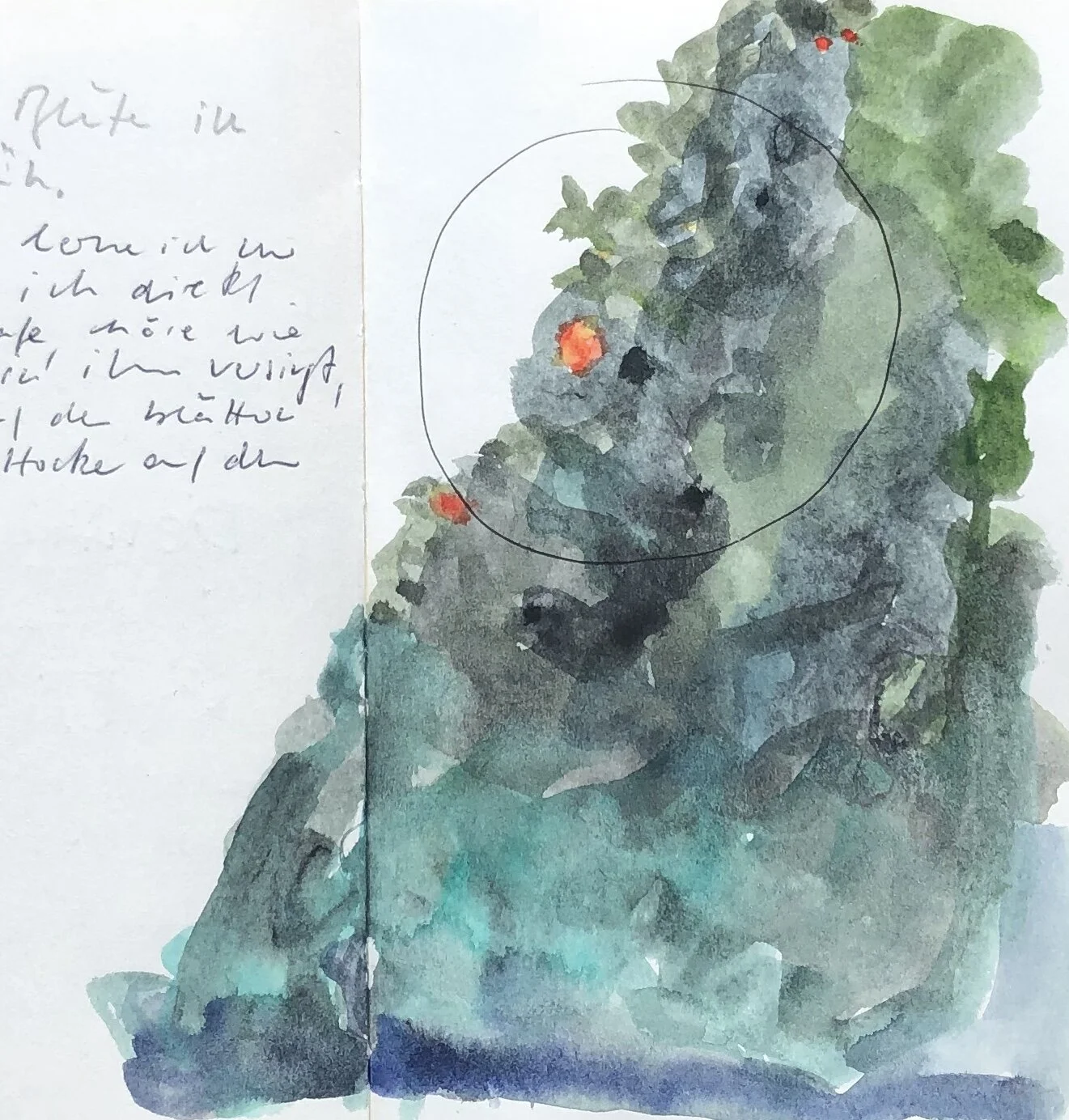 Ich fange die Umgebung mit Aquarellzeichnungen ein. Ohne gerade Unterlage verlaufen die Farben, manche Seite kleben aufeinander. Nicht erkennbar malen, die Farbflächen registrieren und- viel weiss lassen. Unschärfe ist freudiges Ereignis und Zumutung. Malen und nichts sagen wollen, eine Bedeutung stellt sich ein oder nicht.