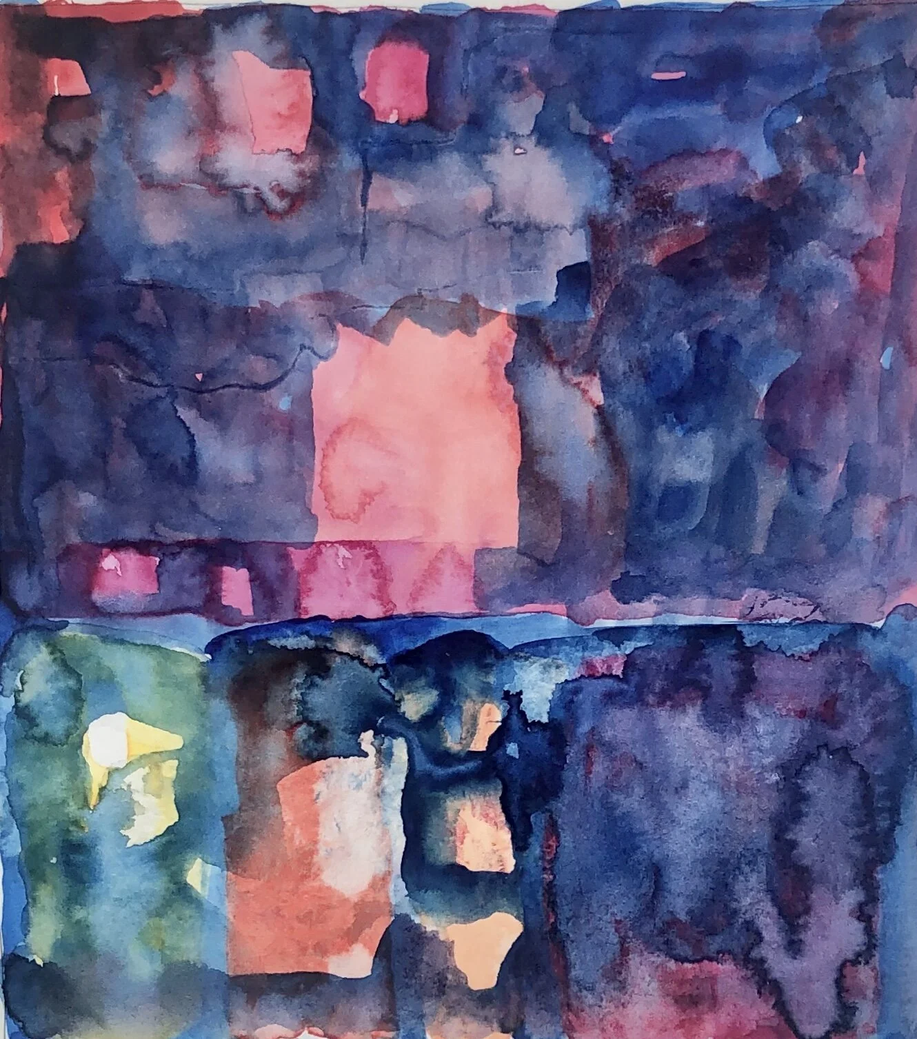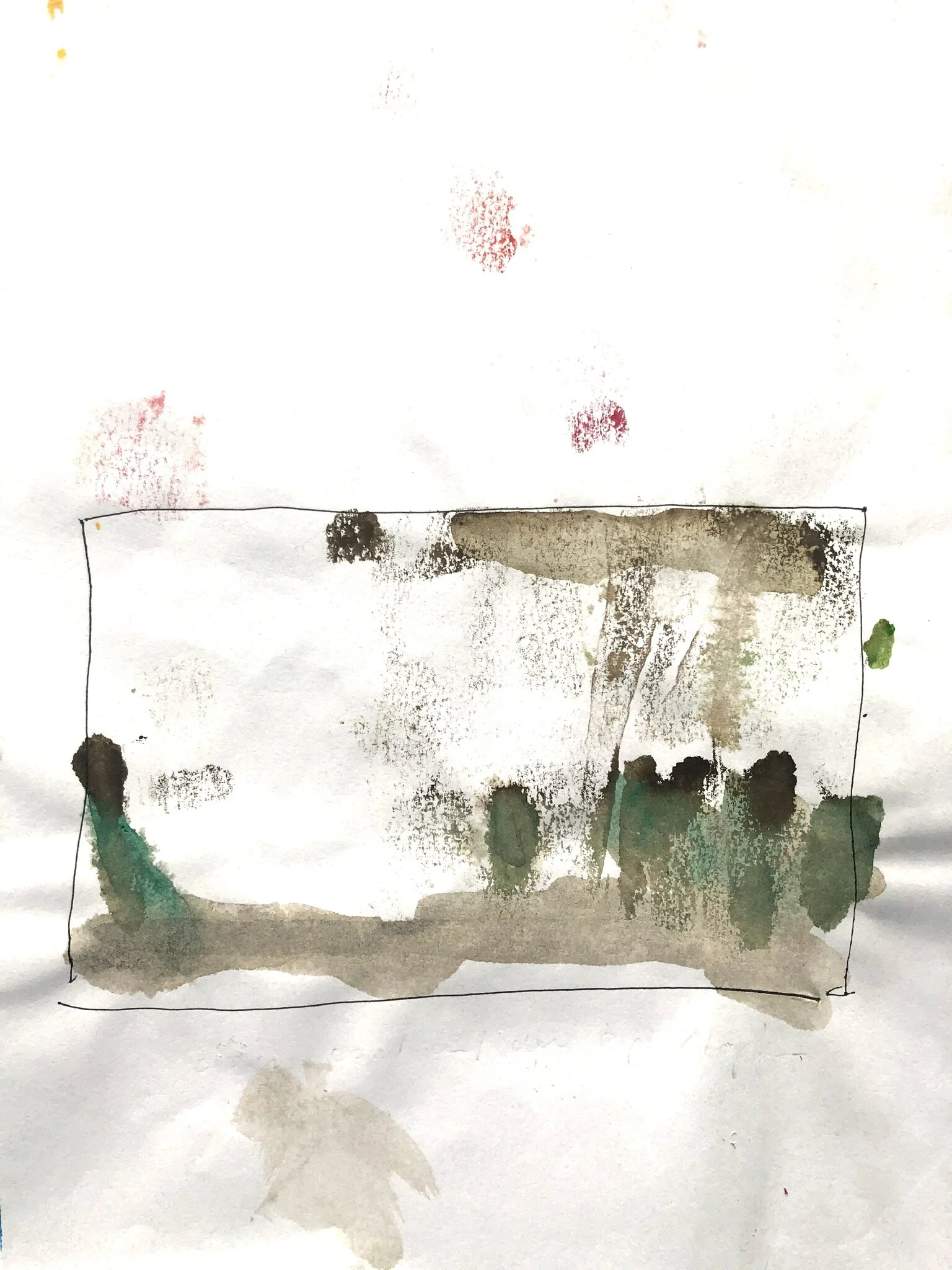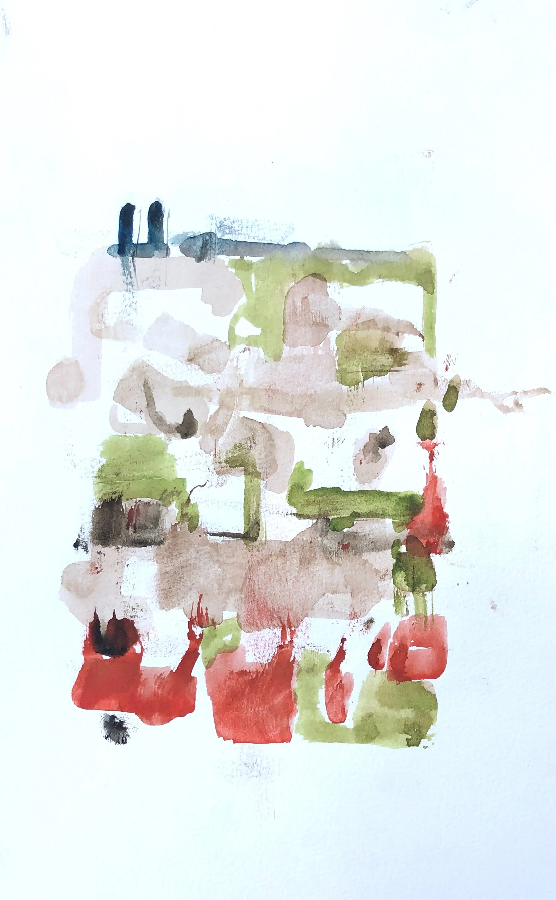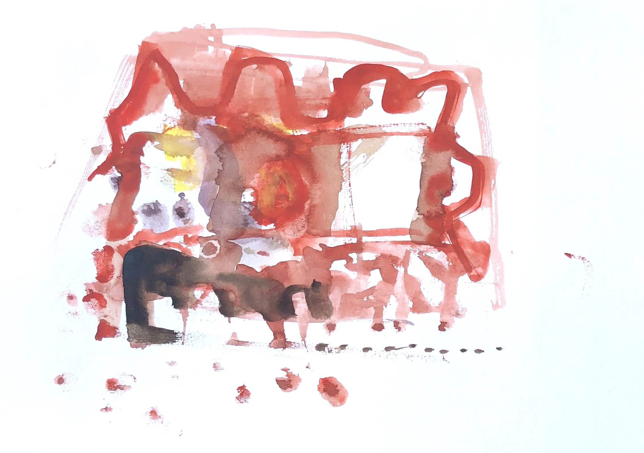 Ich fange die Umgebung mit Aquarellzeichnungen ein. Ohne gerade Unterlage verlaufen die Farben, manche Seite kleben aufeinander. Nicht erkennbar malen, die Farbflächen registrieren und- viel weiss lassen. Unschärfe ist freudiges Ereignis und Zumutung. Malen und nichts sagen wollen, eine Bedeutung stellt sich ein oder nicht.