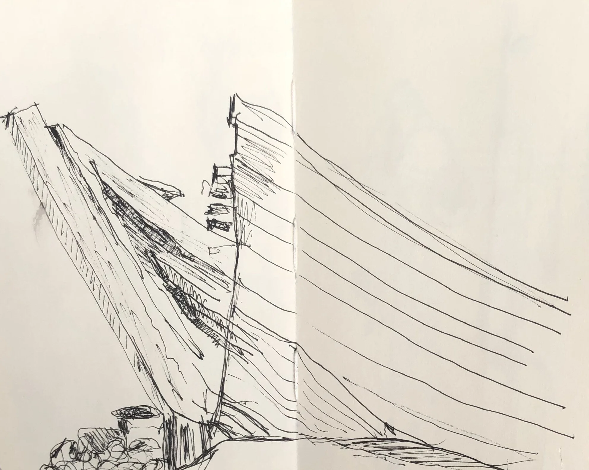 Ein gestrandetes Boot, am Bug zerrissen und aufgebrochen, liegt am Strand. In der Nähe sind Strandbuggys und Kitesurfer. Denen schaue ich zu, bevor ich das Boot sehe, von dem ich schon gehört habe. Seit November 2018 liegt es da, 18 Menschen wurden damals Tod an Land gespült. Derart aufgeladen frage ich mich vor dem Boot stehend, warum ich das jetzt zeichne. Voyeurismus oder was ist das?
